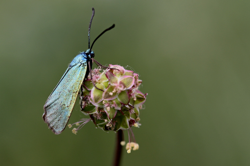 Ruhendes Weibchen des Südwestdeutschen Grünwidderchens auf Kleinem Wiesenknopf im Elsass, Mai 2019.