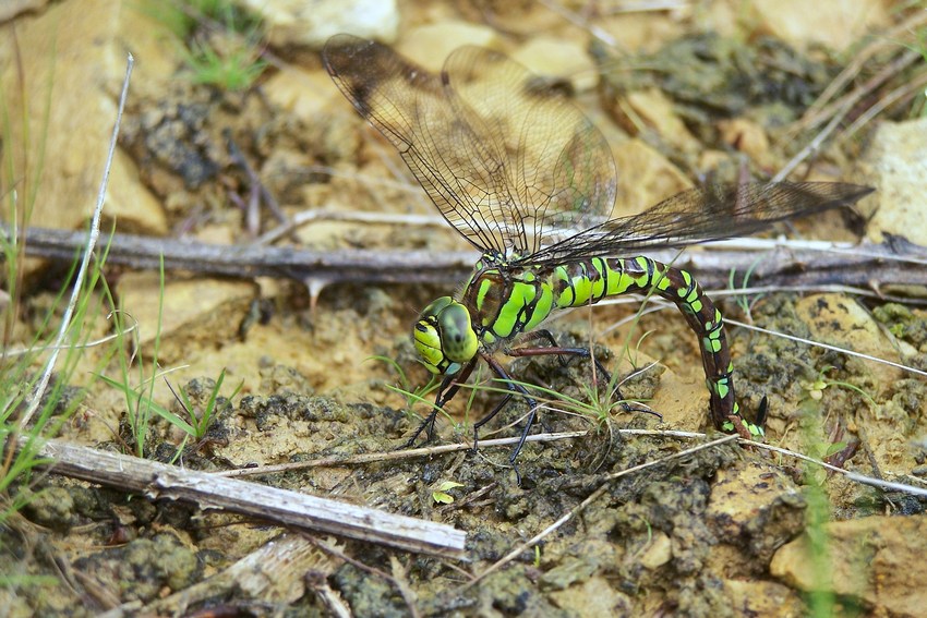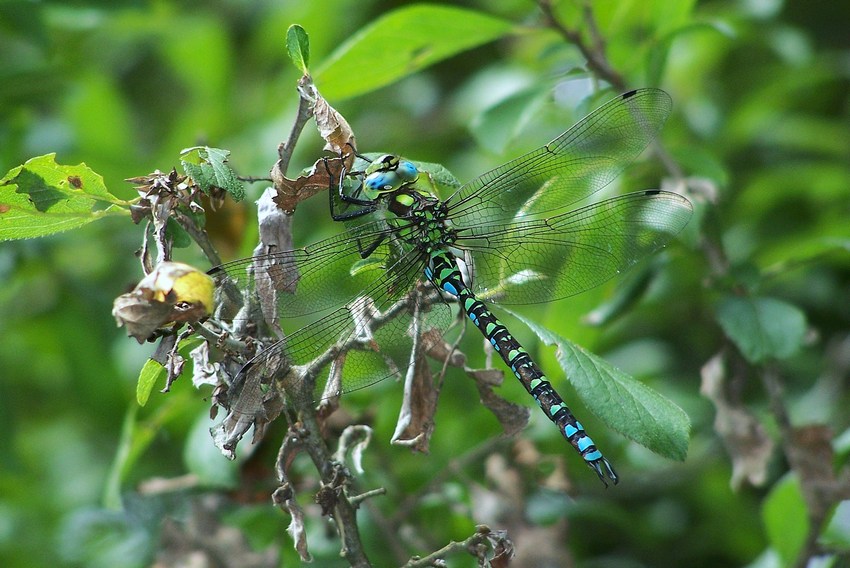 Weibchen der Blaugrünen Mosaikjungfer (Aeshna cyanea) bei der Eiablage im Albvorland (Dettenhausen), Juli 2010.
