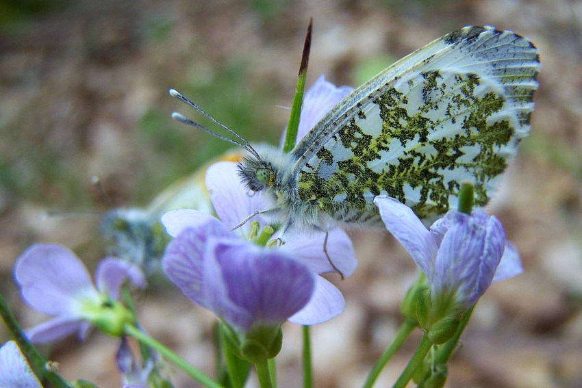 Weibchen des Aurorafalters (Anthocharis cardamines) auf Wiesenschaumkraut im Albvorland (NSG Schaichtal), April 2008.