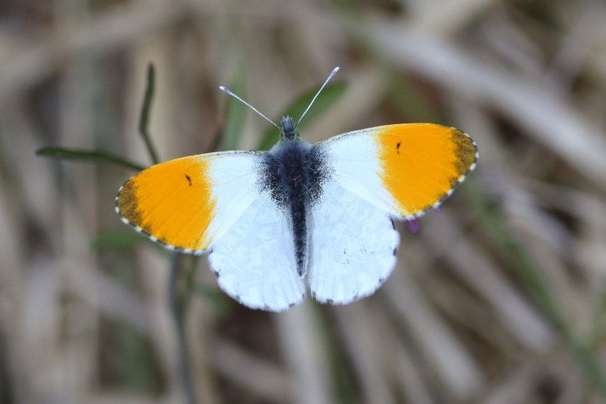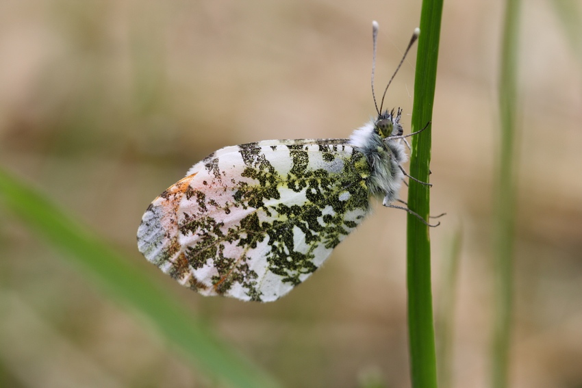 Ruhendes Männchen des Aurorafalters auf der Schwäbischen Alb (Blaubeuren), Mai 2014.