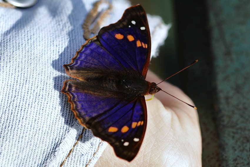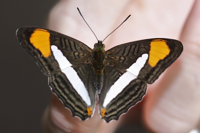 Gerne kamen die verschiedenen Falterarten zum Saugen von Salzen auf die Hand, so auch dieser an unsere Schillerfalter erinnernde Doxocopa agathina.