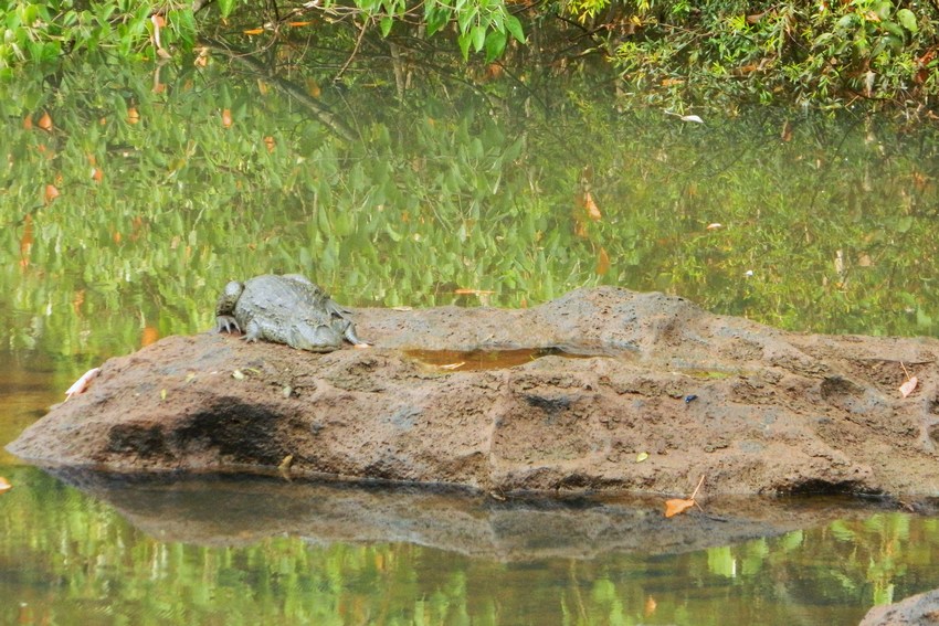Alligator auf einer Felsbank an den Wasserfällen bei Iguazu.
