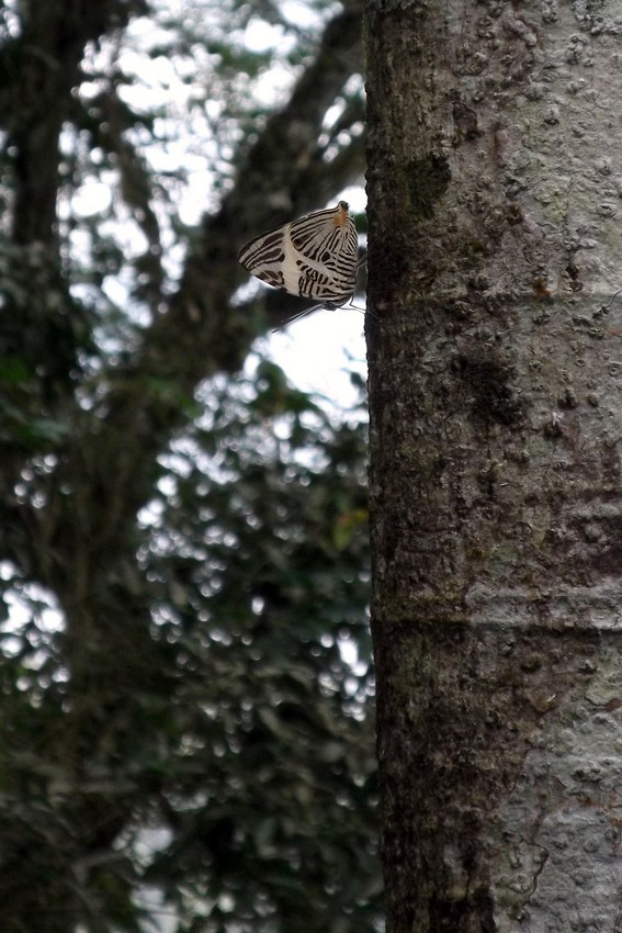Diese sehr großen Tagfalter (Flügelspannweite 10-15 cm) sind perfekt an der Rinde von Baumstämmen getarnt, bei dieser Art könnte es sich um Hamadryas feronia handeln.
