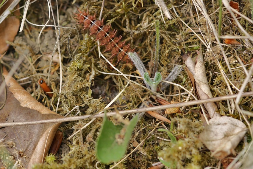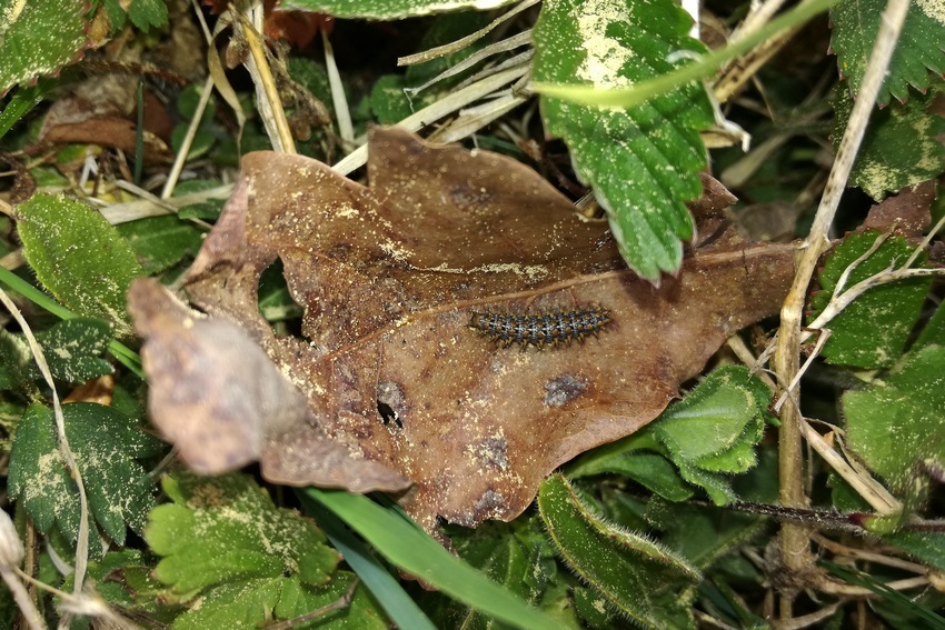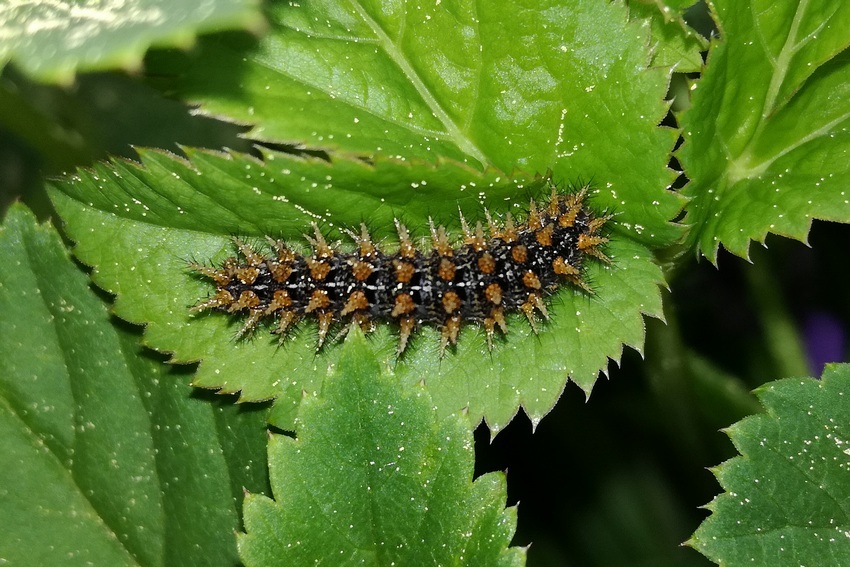 Halbwüchsige Larve des Feurigen Perlmutterfalters auf einer Schlagflur im württembergischen Allgäu (Leupolz), Mai 2018.