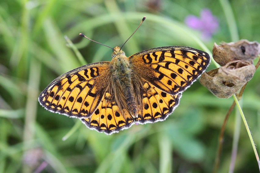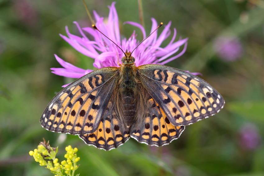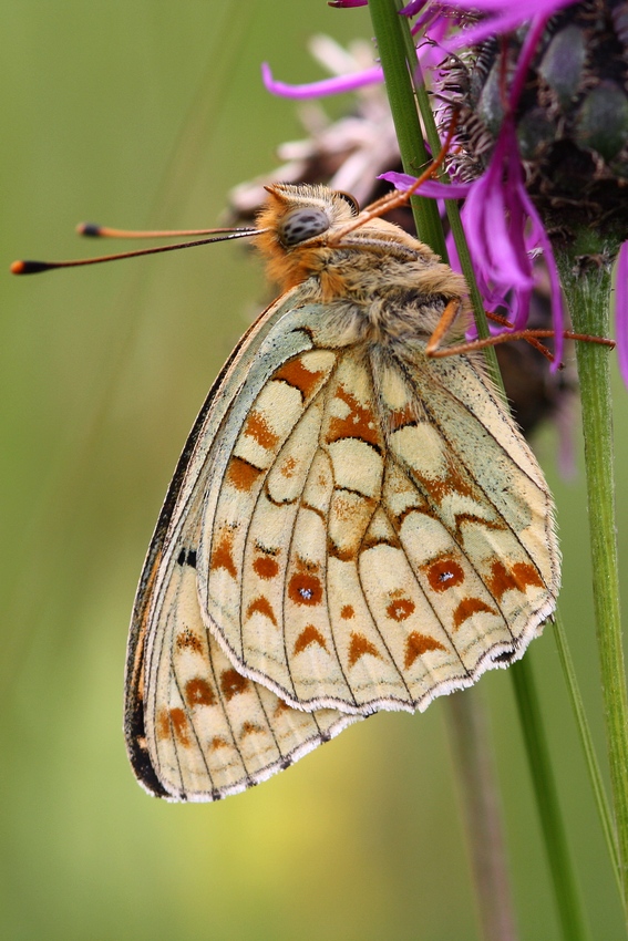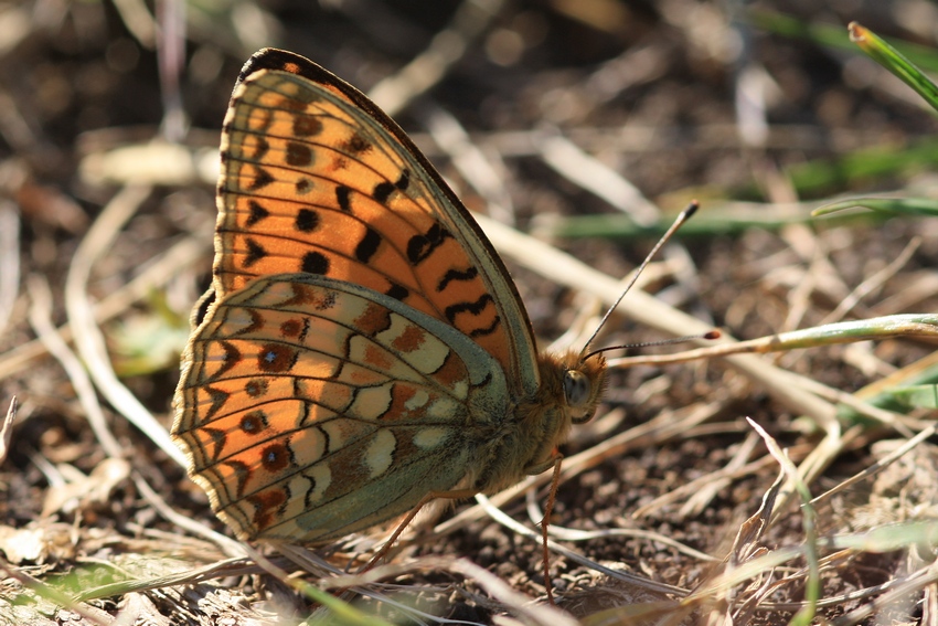 Charakteristisch dunkel gefärbtes Weibchen des Mittleren Perlmutterfalters auf der Schwäbischen Alb (NSG Hochwiesen-Pfullinger Berg), Juni 2018.