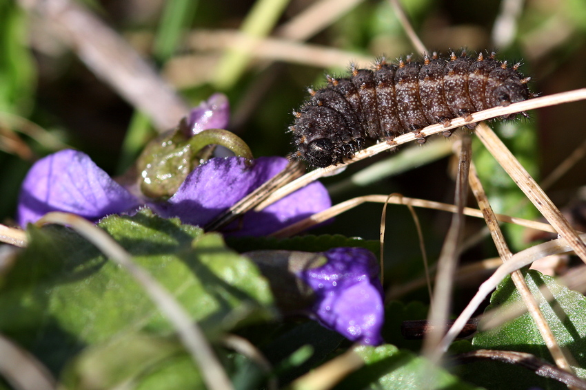 Jüngere Raupe des Magerrasen-Perlmutterfalters im Albvorland (NSG Hirschauer Berg), März 2021.