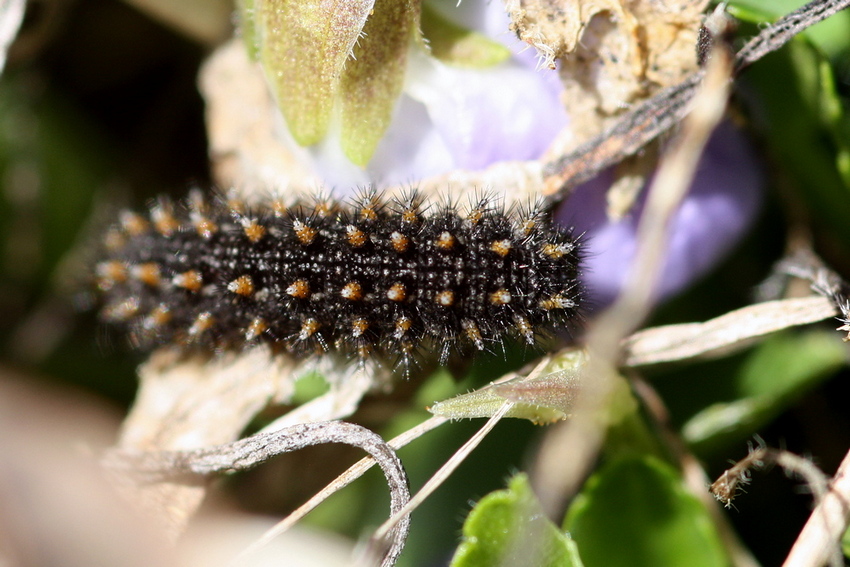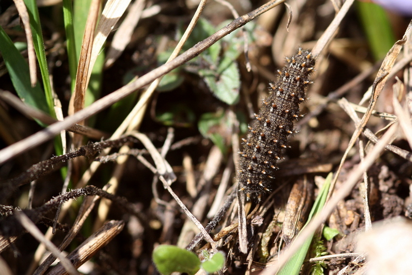 Larve des Magerrasen-Perlmutterfalters auf einem Halbtrockenrasen in den Oberen Gäuen (Schafhausen), April 2018.
