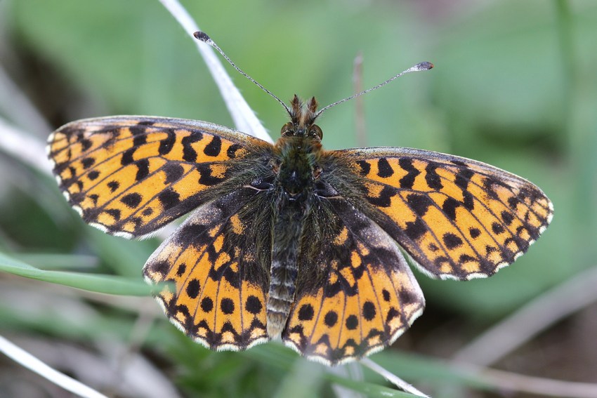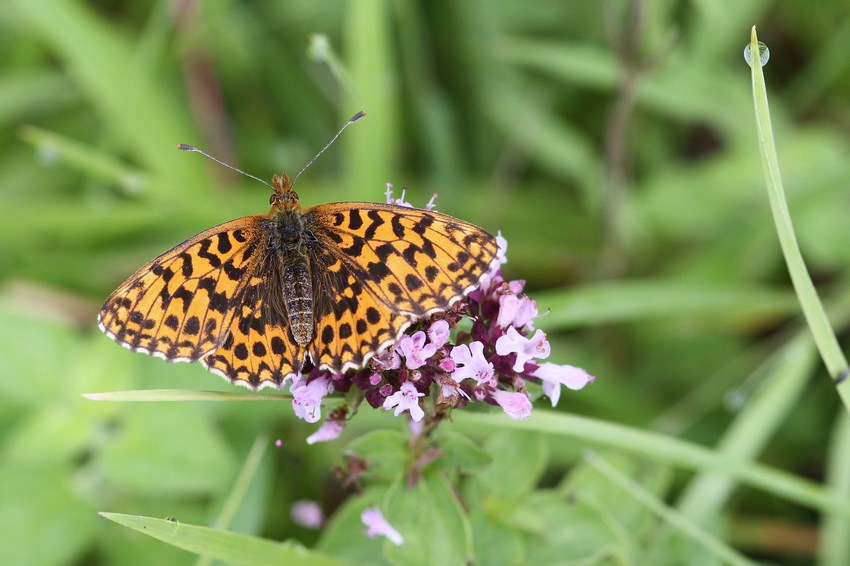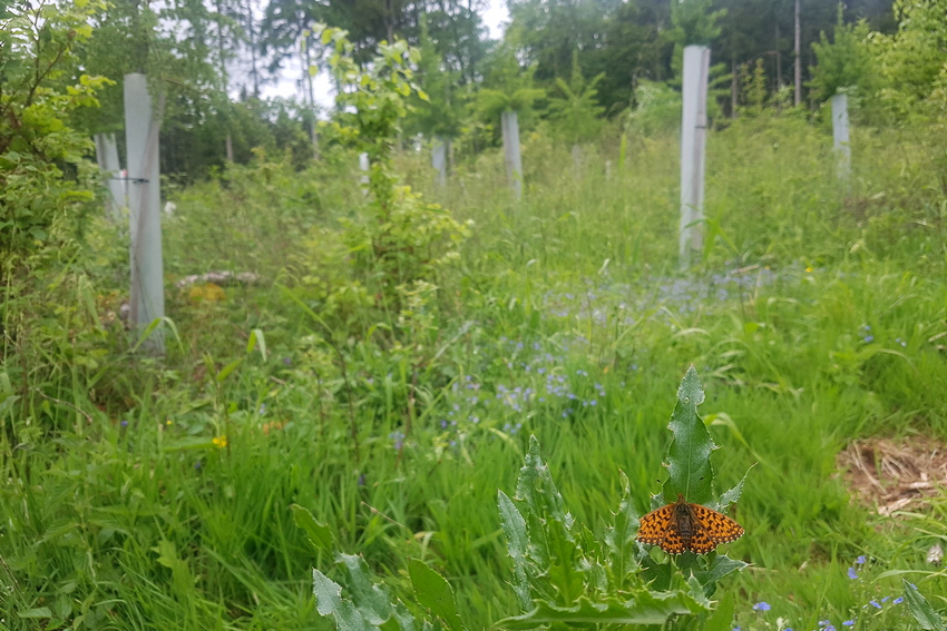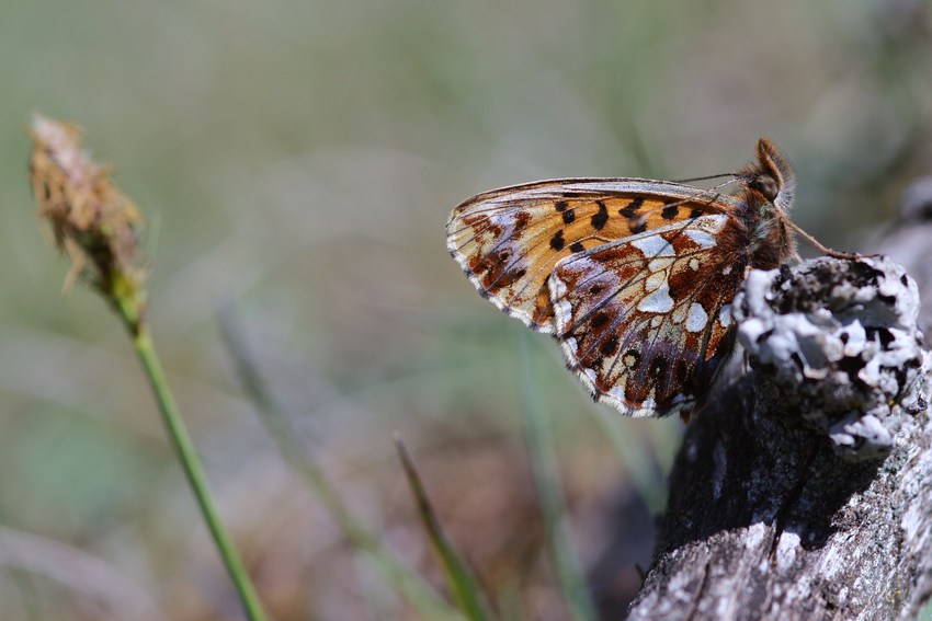 Für manche ein ungewohntes Bild: Imago des Magerrasen-Perlmutterfalters auf einem Kahlhieb auf der Schwäbischen Alb (Ingstetten), Juni 2021.
