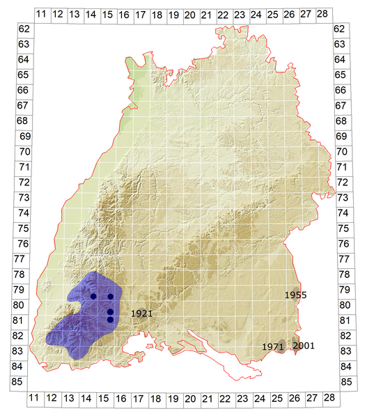 Grauer Bereich: Ehemals belegte Vorkommen (letztes Nachweisdatum)