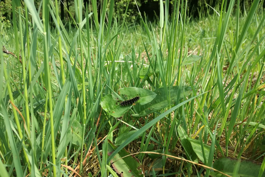 Sich sonnende Raupe des Natterwurz-Perlmutterfalters im Larvalhabitat im Südschwarzwald (Vöhrenbach), Mai 2018.