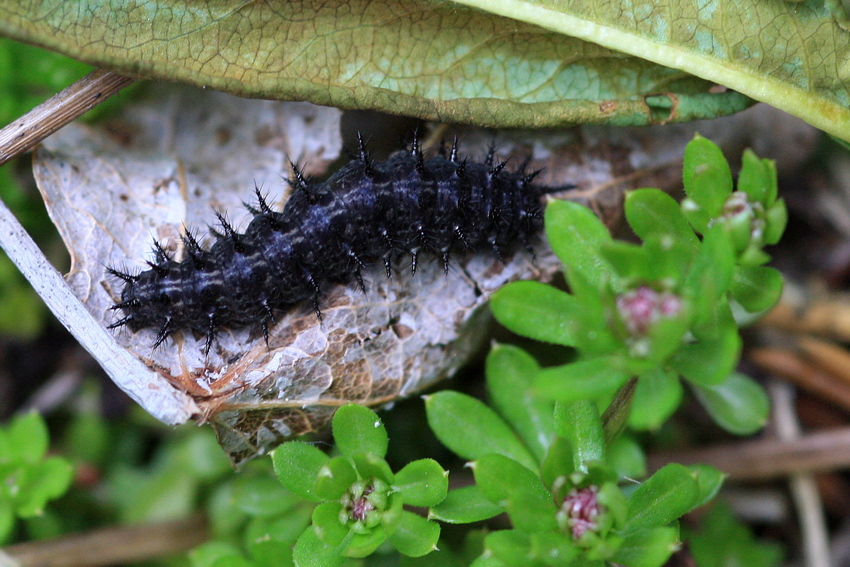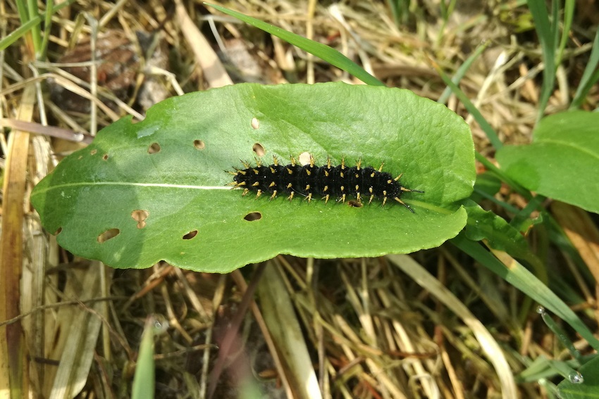 Sich sonnende Raupe des Natterwurz-Perlmutterfalters im Südschwarzwald (Vöhrenbach), Mai 2018.