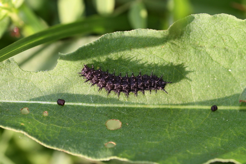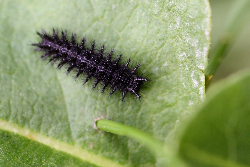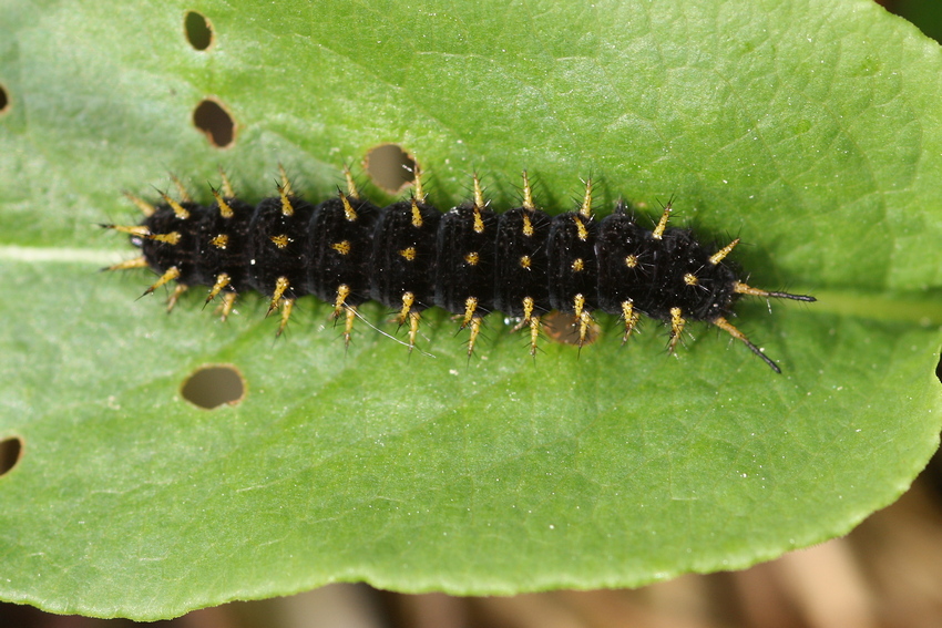Aufsicht auf eine Jungraupe des Natterwurz-Perlmutterfalters im Südschwarzwald (Vöhrenbach), Mai 2019.