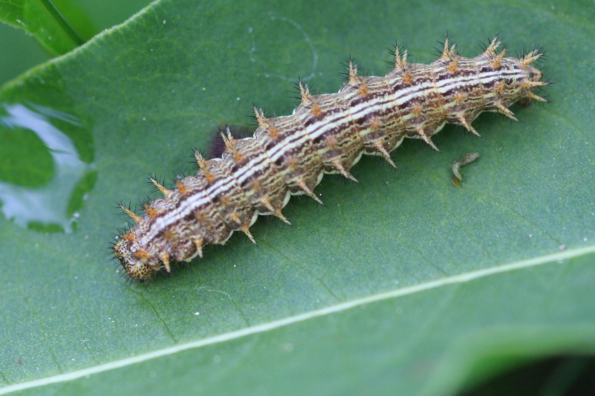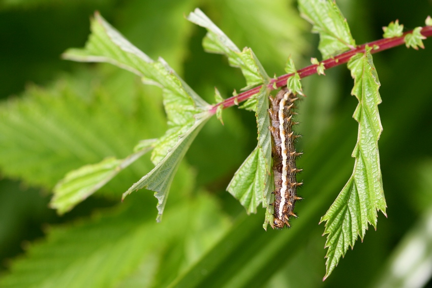 An Mädesüß fressende Raupe von B. ino in Oberschwaben (Deggenhausertal), Mai 2015.