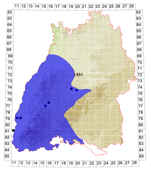 Grauer Bereich: Ehemalige Vorkommen (letztes Nachweisdatum)