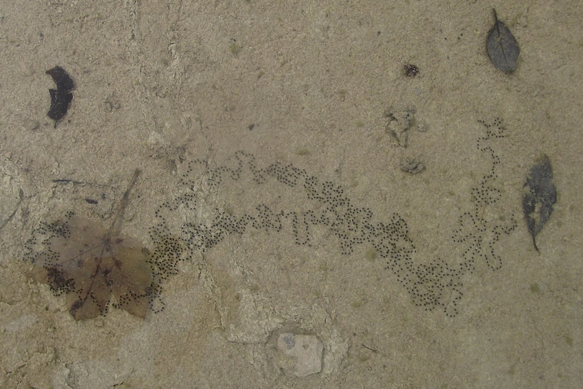 Charakteristischer Kreuzkröten-Laich in einer temporären Pfütze am Albtrauf (Dotternhausen), Mai 2013.