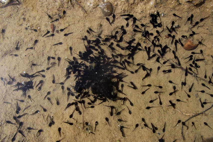Kaulquappen der Kreuzkröte an einer ertrunkenen Laufkäferlarve fressend, Oberschwaben (Laupheim), Mai 2015.