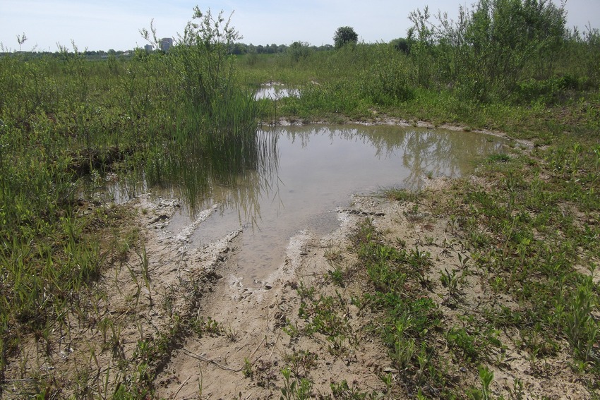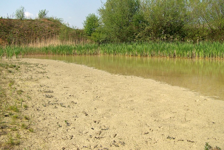 Detailblick auf das Flachgewässer aus voriger Aufnahme: Zeitweise austrocknendes, voll besonntes Kleingewässer mit sandigen Ufern.