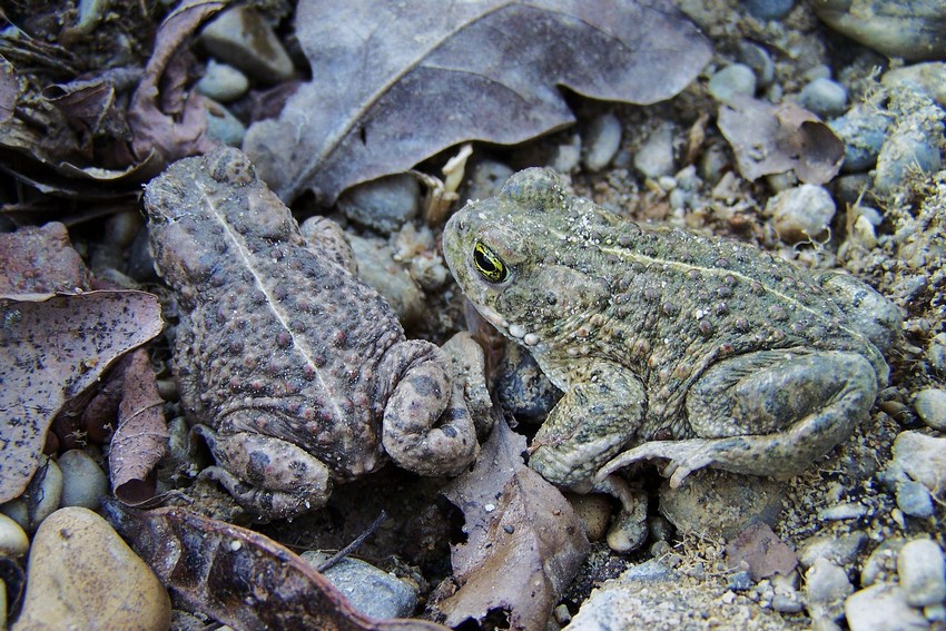 Zwei Kreuzkröten in einer ehemaligen Kiesgrube in Oberschwaben (Baltringen), April 2009.