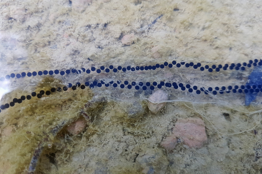 Detailaufnahme des Laichs der Kreuzkröte in einem Flachgewässer im württembergischen Allgäu (Arnach), Mai 2021.