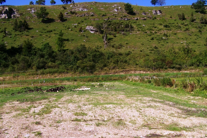 Lebensraumkomplex von E. calamita auf der Schwäbischen Alb (Wasserstetten): Wacholderheide im Hintergrund als potentieller Landlebensraum, Wagenspuren und Brachegelände im Vordergrund.