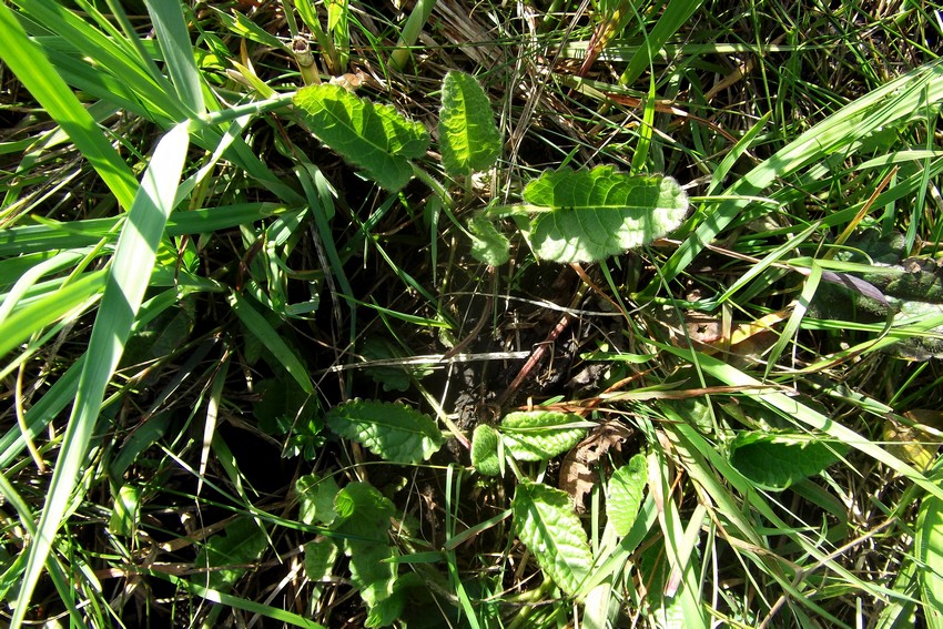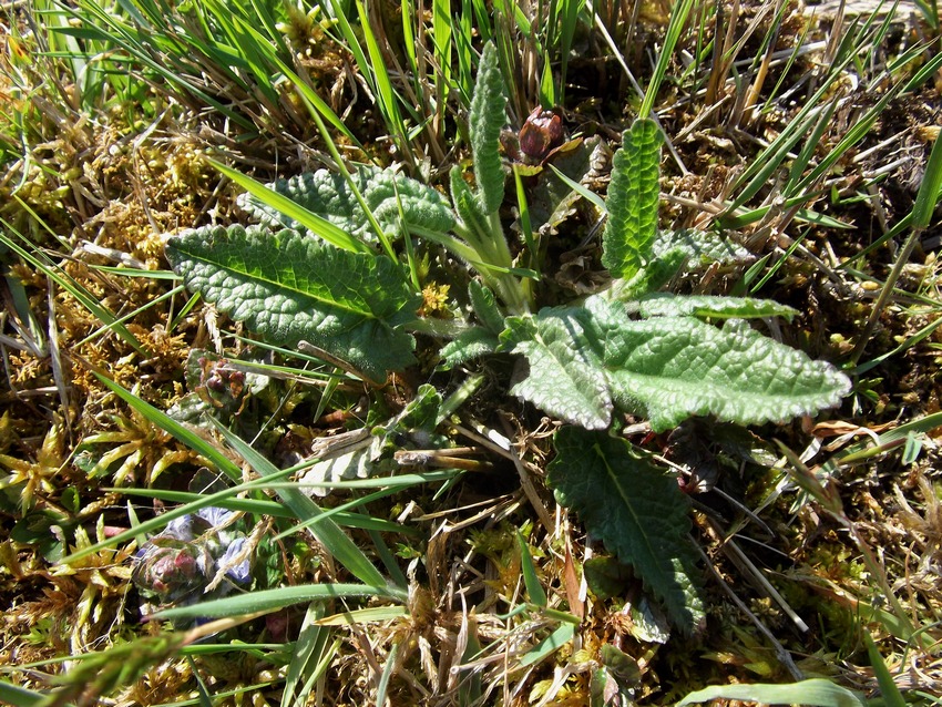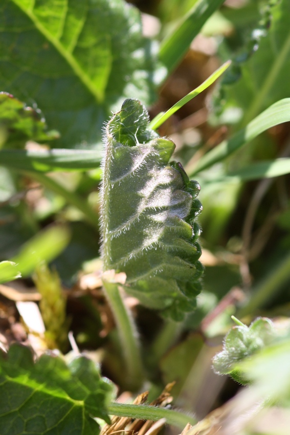 Belegte Pflanze von Betonia officinalis mit typischem rundlichem Blattfraß und Blatttüte, Grenzgebiet Bayern/Baden-Württemberg, April 2014.