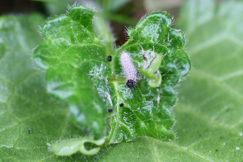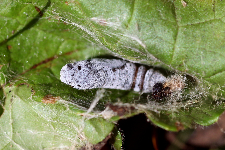 Jüngere Larve des Heilziest-Dickkopffalters in einer geöffneten Blatttüte im württembergischen Allgäu (Neukirch), Juli 2017.