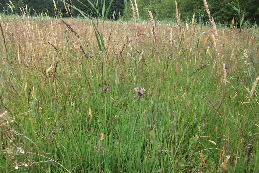 Besiedeltes Habitat im Westallgäuer Hügelland, eine magere und schwachwüchsige Streuwiese mit guten Heilziest-Beständen.