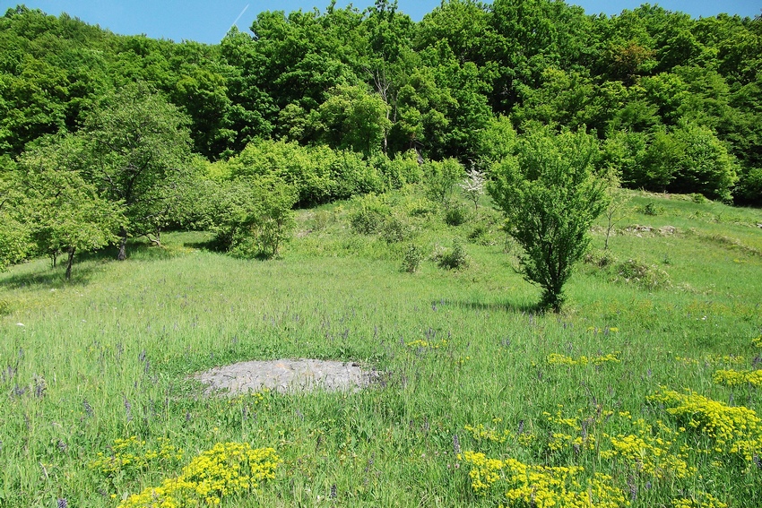 Offenland-Habitat des Gelbwürfeligen Dickkopffalters im Albvorland (Breitenholz), ein strukturreicher, teilweise versaumter Halbtrockenrasen-Hang.