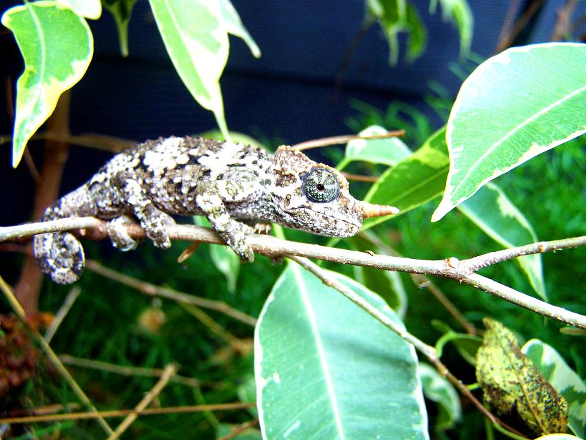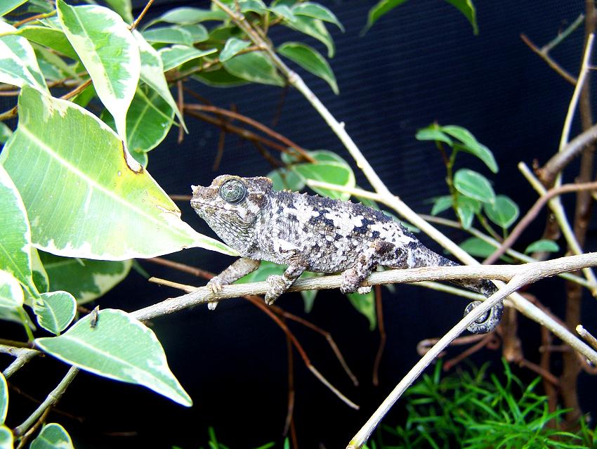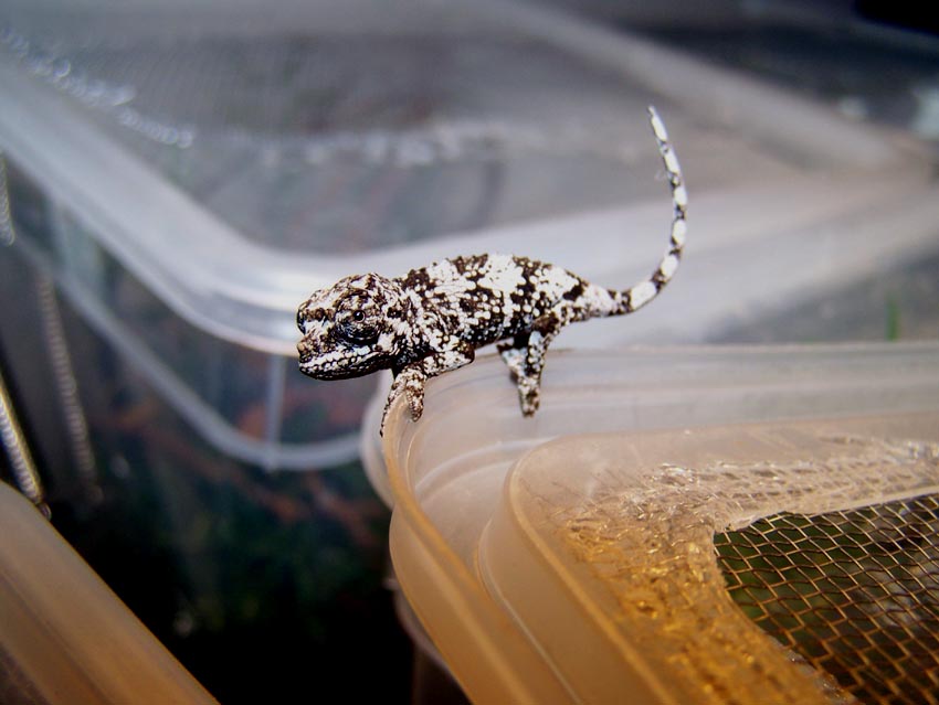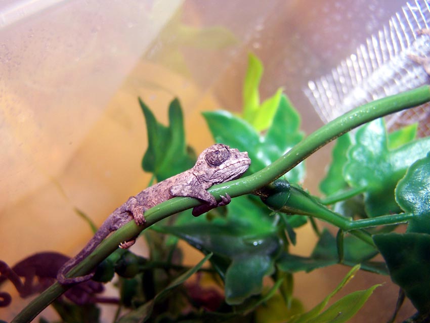 Ende Januar 2008 gebar das Weibchen 14 lebende Jungtiere, die ich in kleineren Gruppen aufgezogen habe. 13 Jungtiere überlebten die ersten 6 Monate. Ich stellte jedoch fest, dass meine Beleuchtung (T5-Röhren) während der Wintermonate nicht ausreichend war und die kleinen Chamäleons nur mäßig wuchsen. Bei einigen Tieren waren dann zum Ende des Winters bereits leichte Mangelerscheinungen feststellbar. Mit dem Umzug auf die Terrasse im April/Mai 2008 gaben sich diese Probleme jedoch von selbst und die Chamäleons wuchsen den Sommer über gut. Bis zum Winter 2008 gab ich alle Nachzuchten ab. Schon ab März können die Tiere an warmen sonnigen Tagen nach draußen gestellt werden.