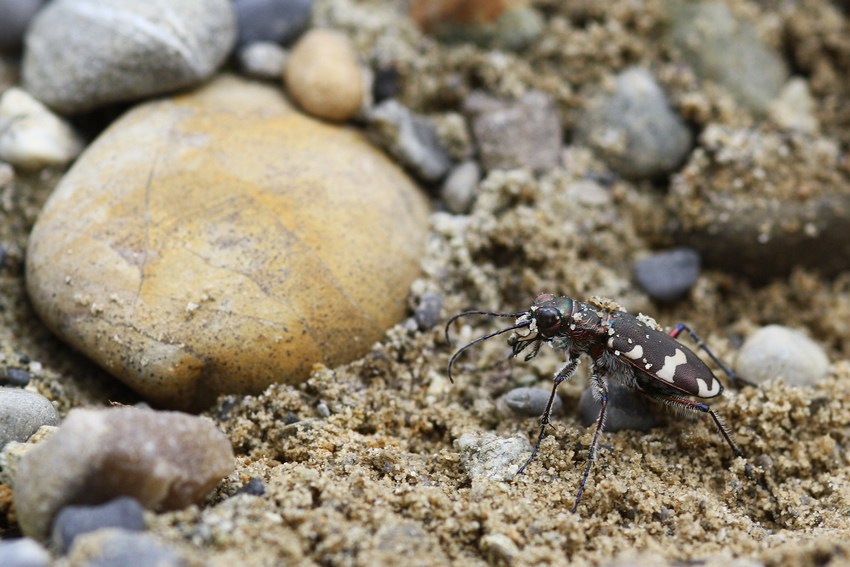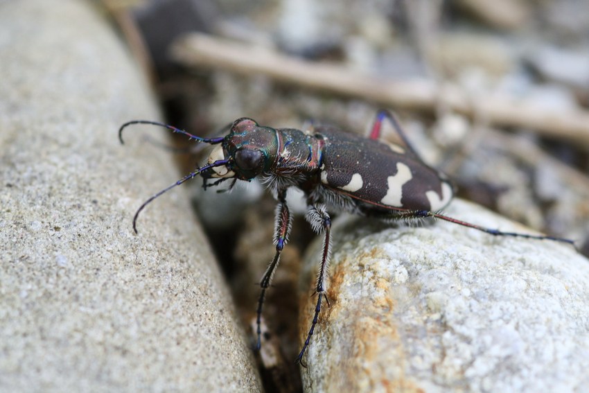 Aufsicht auf ein ruhendes Exemplar des Dünen-Sandlaufkäfers in Oberschwaben (Ursendorf), Mai 2016.