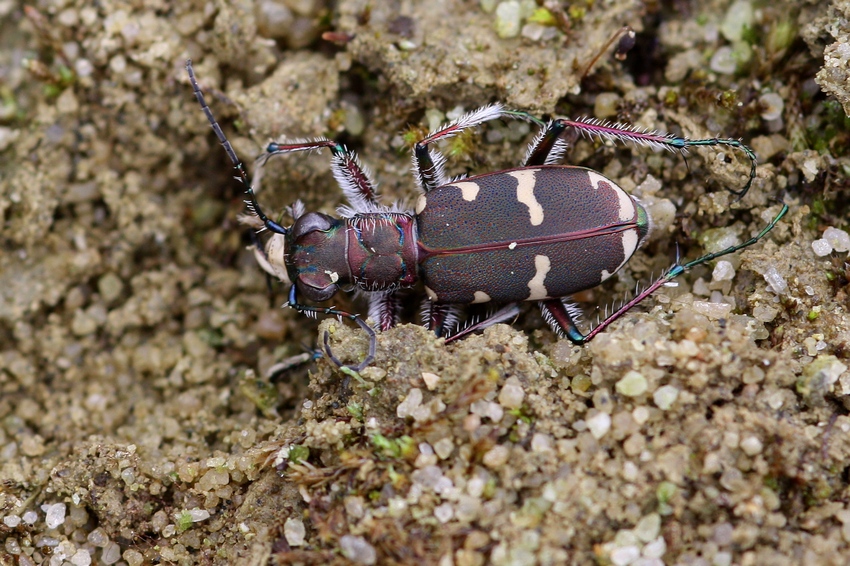 Dünen-Sandlaufkäfer (Cicindela hybrida) in einer ehemaligen Kiesgrube in Oberschwaben (Baltringen), April 2010.