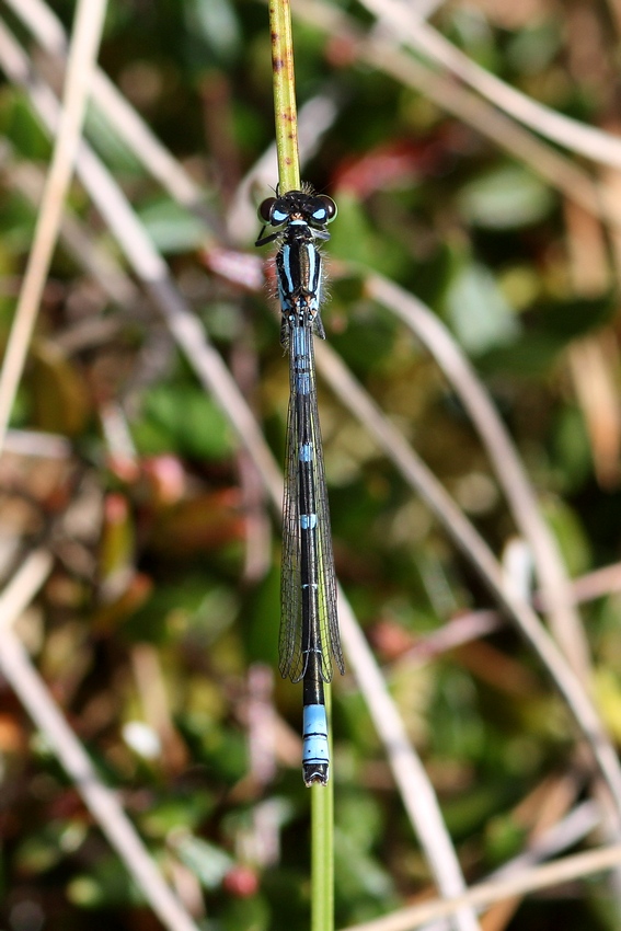 Aufsicht auf ein Männchen der Mond-Azurjungfer, gut zu erkennen ist die sichelmondartige Zeichnung auf dem 2. Abdominalsegment, Oberschwaben Mai 2016.
