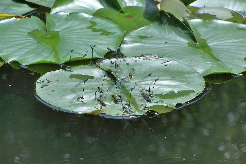Mehrere Hufeisen-Azurjungfern bei der Eiablage auf Seerosenblättern im Albvorland (Dettenhausen), Juni 2008.