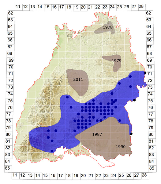 Grauer Bereich: Ehemalige Vorkommen (letztes Nachweisdatum)