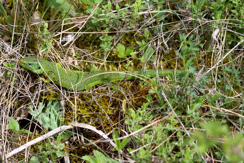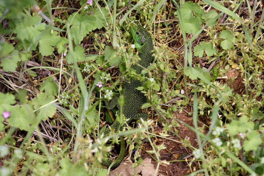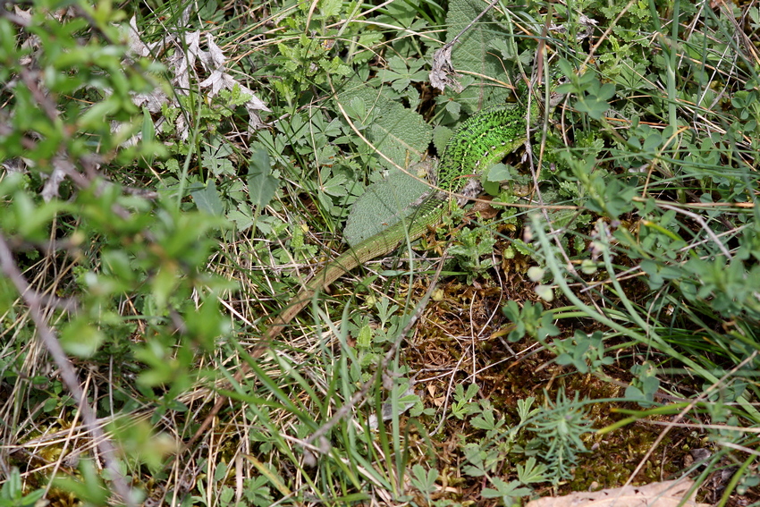 Ebenfalls gut versteckt im frischen Grün waren die zahlreichen Westlichen Smaragdeidechsen (Lacerta bilineata), hier ein Weibchen.