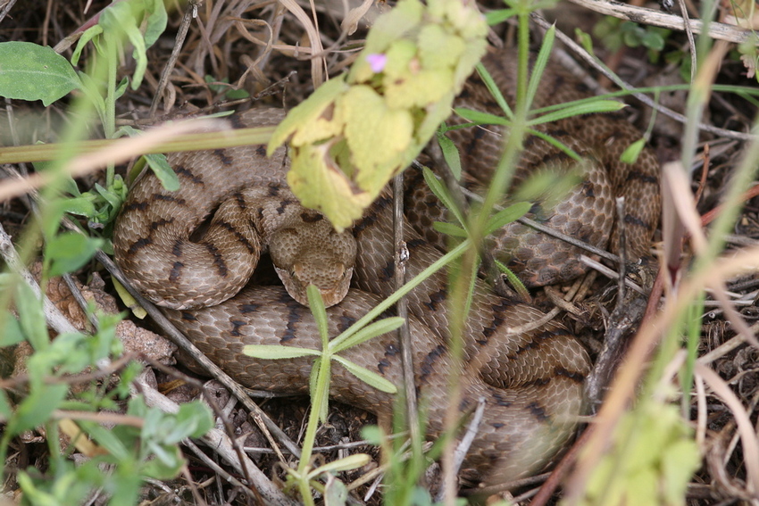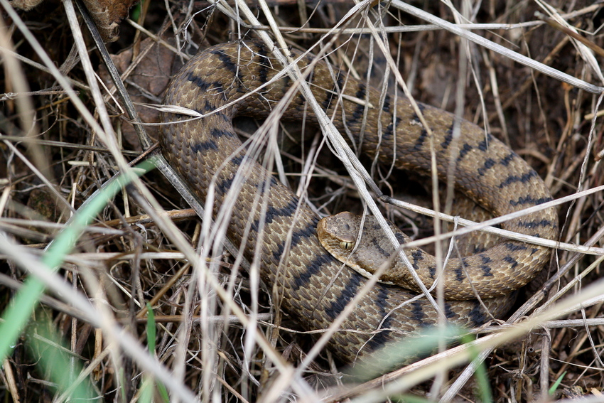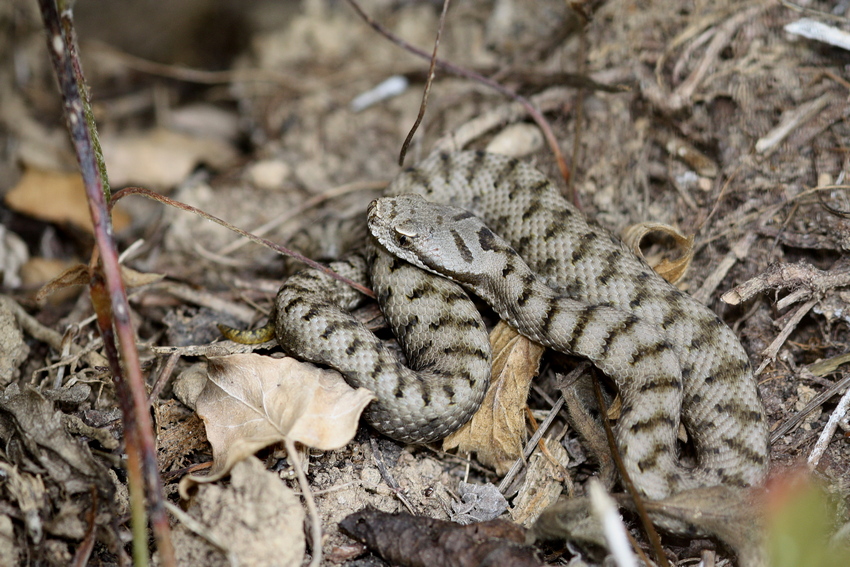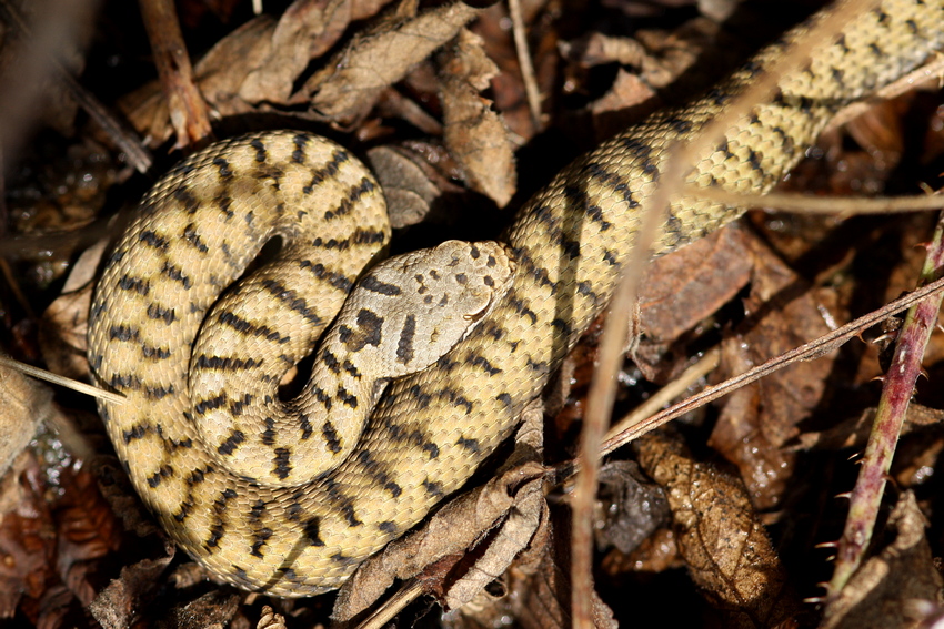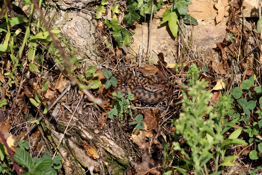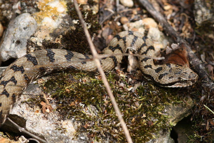 Weitere, sich sonnende Aspisviper mit den charakteristischen Querbalken der Nominatform.