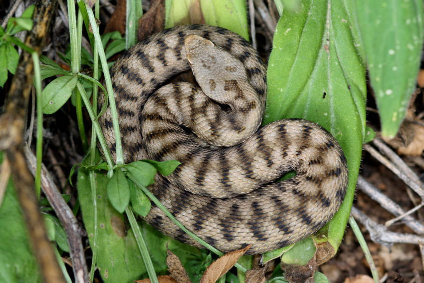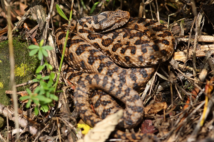 Sich sonnendes, etwa einjähriges Jungtier der Aspisviper in Aufsicht am Bollenberg.