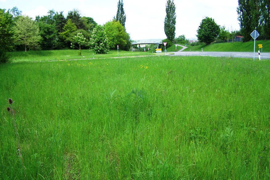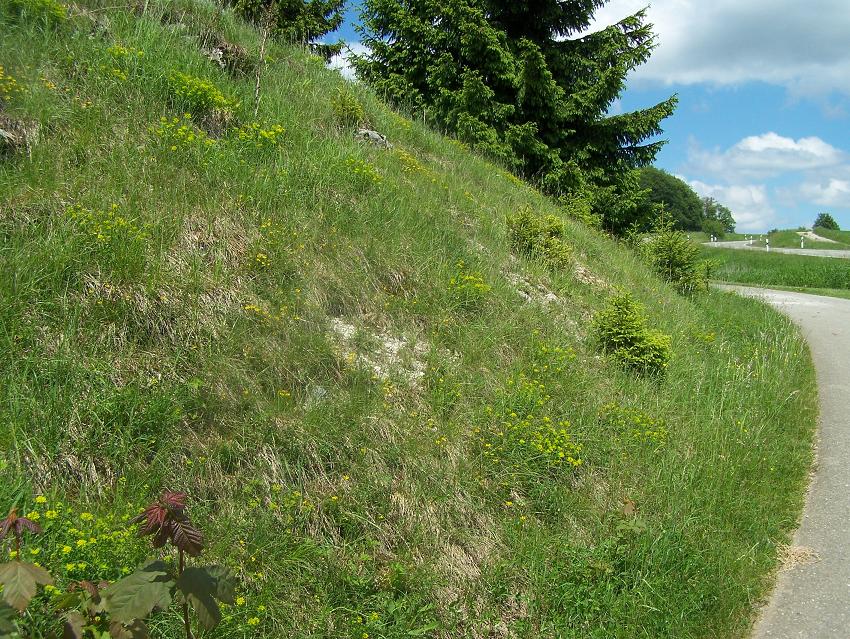 Relativ unspektakulär sieht auch diese Verkehrsnebenfläche am Rande des Schönbuchs aus. Hier siedelt eines der letzten E. medusa-Vorkommen in diesem Naturraum. Das magere Habitat zeichnet sich durch extremen Streureichtum aus, der wahrscheinlich durch einmal jährliches Mulchen der Fläche zustande kommt. Die Population dieses Habitats könnte noch Kontakt mit den Vorkommen der östlichen Ausläufer der Oberen Gäue haben. Doch wie lange könnte eine solche Population noch bestehen, wäre sie komplett isoliert?