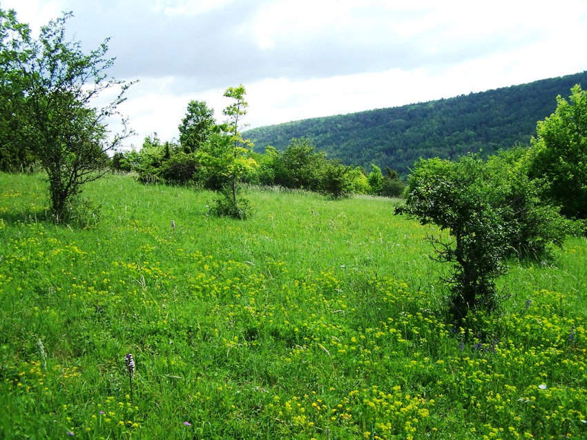 Mageres, sonnenexponiertes Grünland auf der Schwäbischen Alb. Direkt in Straßennähe finden sich hier noch höchstens extensiv genutzte, streureiche Wiesenflächen, die von E. medusa besiedelt werden. E. medusa gehört in solchen Habitaten auf der Alb zu den häufigsten Schmetterlingsarten. Derartige Habitate sind in Oberschwaben und im Albvorland fast immer intensiv landwirtschaftlich genutzt und entsprechend eutrophiert.