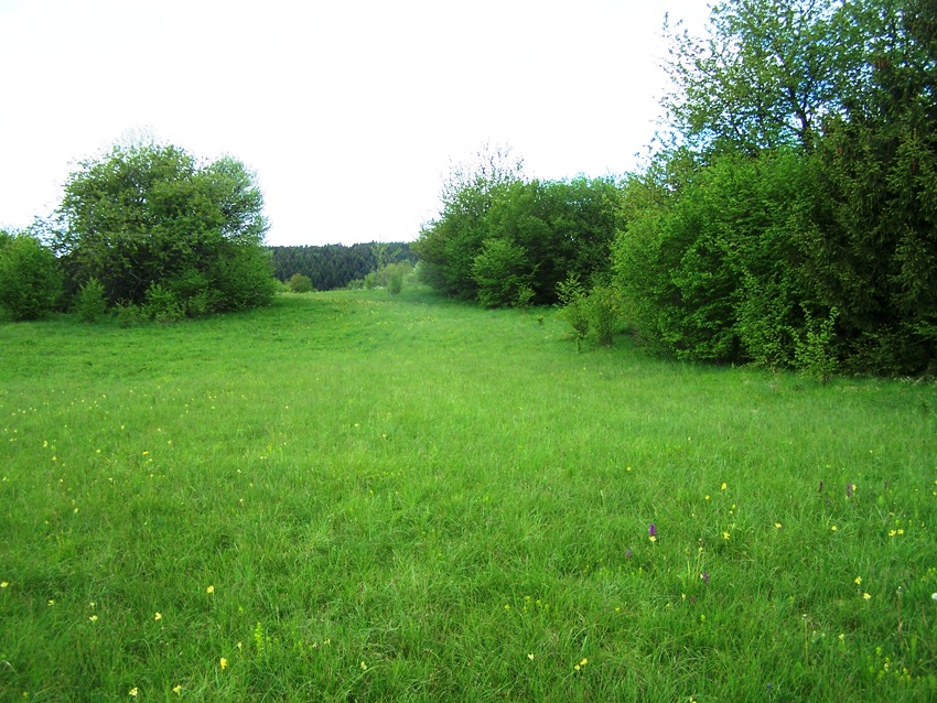 Eine magere, streureiche und mit Schlüsselblumen durchsetzte Wiese bei Löffingen im Baar-Wutach-Gebiet: Hier fliegen im Frühjahr neben E. medusa auch der Schlüsselblumen-Würfelfalter (Hamearis lucina) und der Zwergbläuling (Cupido minimus).