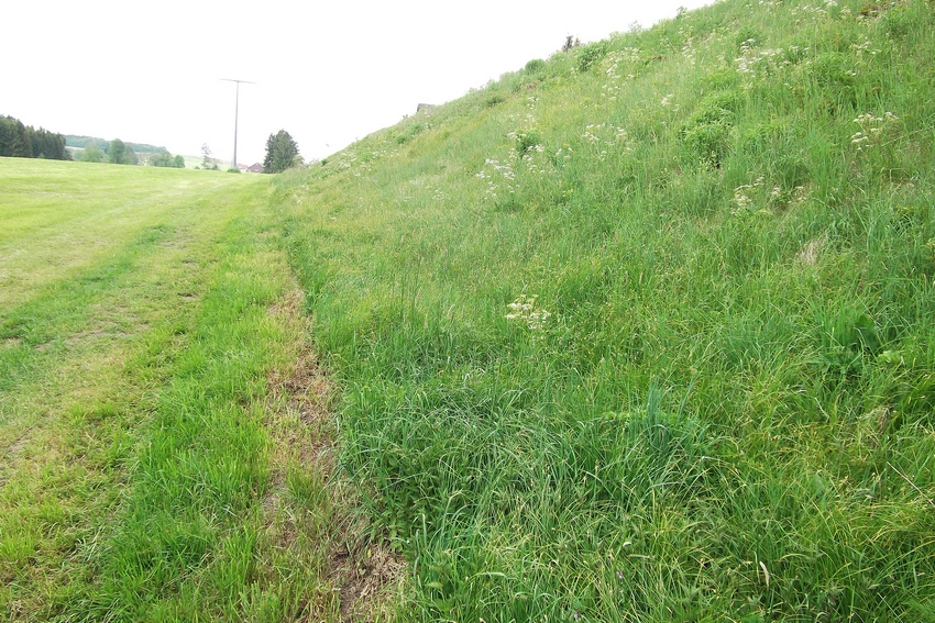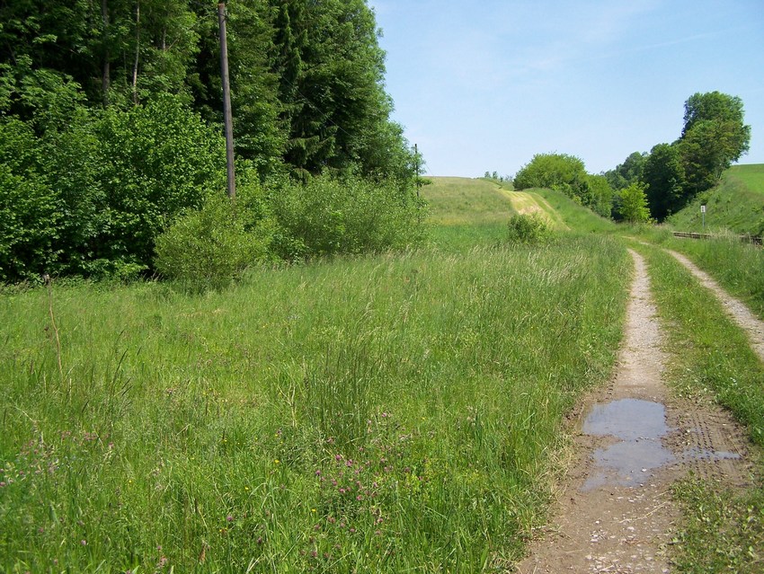 Bahndamm im Westallgäuer Hügelland bei Gebrazhofen. An diesen eher mesophilen, jedoch streureichen und meist südexponierten Bahndämmen kann E. medusa auch aktuell noch in geringer Individuenzahl angetroffen werden.