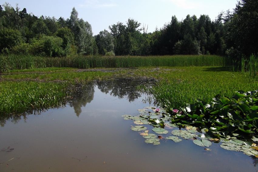 Habitat des Großen Granatauges im Albvorland (Böblingen), ein Weiher mit reichlich Schwimm- und Tauchblattvegetation.