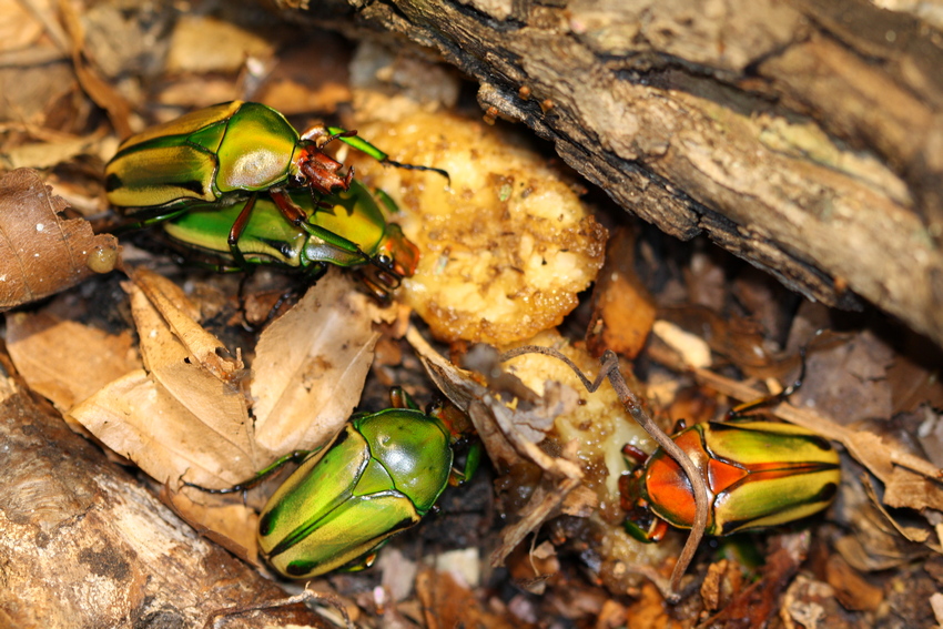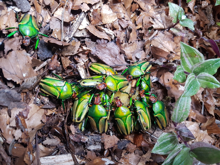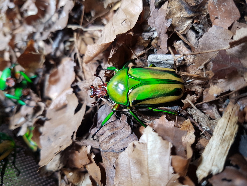 Diese relativ kleine, aber attraktive Art halte ich seit Dezember 2019. Die Käfer sind sehr aktiv, wenn man ihnen ausreichend Licht und Wärme bietet. Dann legen die Weibchen auch zahlreiche Eier, aus denen die kleinen L1 schlüpfen. Es sind leicht mehrere hundert Larven aus wenigen Käferpaaren zu erzielen. Die Aufzucht der Larven ist denkbar einfach und funktioniert sehr gut mit Laubwaldhumus, den ich zuvor mit dem Gartenhäcksler homogenisiere. In Boxen der Größe 50x30x30 cm lassen sich bis zu 50 Larven aufziehen, allerdings muss dann das Substrat spätestens alle 2-3 Monate gewechselt werden, da die Larven es sehr schnell verwerten. Kannibalismus konnte ich auch bei hoher Larvendichte und Futtermangel nicht beobachten. Die Larven sind erstaunlich ausdauernd und überstehen auch solche Mangelphasen, allerdings führt dies zu kleineren Imagines. Die Generationsfolge kann bei guten Bedingungen recht schnell sein, sodass ich teilweise bereits wieder neue Käferimagines und noch ältere Käfer der vorigen Generation parallel hatte. Für den Anfänger in der Käferzucht ist diese Art aufgrund ihrer Anspruchslosigkeit und der schönen Färbung sehr zu empfehlen. Große Männchen mit kräftigem Horn sind optisch ein echter Hingucker. Neben der normalerweise grünlich-gelben Färbung treten auch immer wieder Individuen mit einem Rotstich auf. Ich halte die Käfer mittlerweile in der fünften Generation, ohne dass es bisher zu Inzuchterscheinungen oder einem Nachlassen der Reproduktionsrate gekommen wäre.