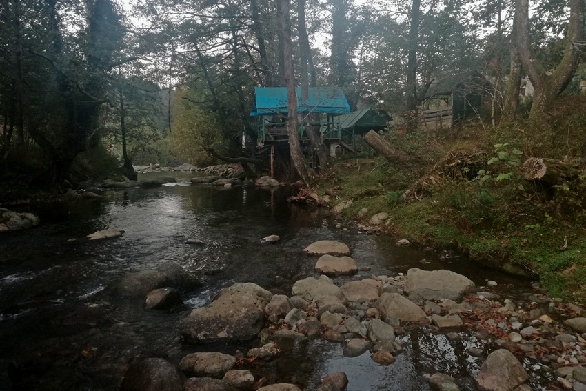 Das Restaurant in aufgeständerten Holzhütten direkt am Fluss im Charnali-Tal.