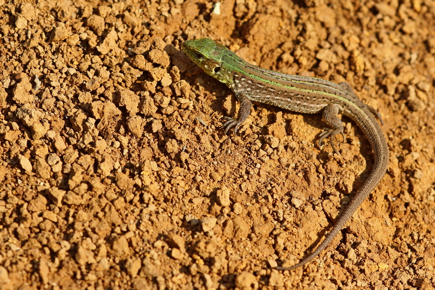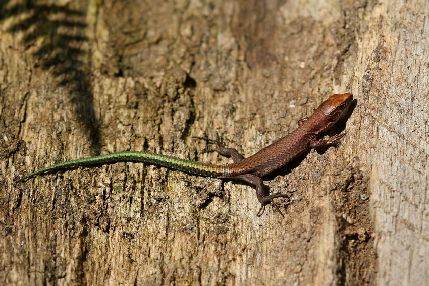 Aufsicht auf das Jungtier der Zauneidechse; gut zu erkennen ist die dorsale Längsstreifung.