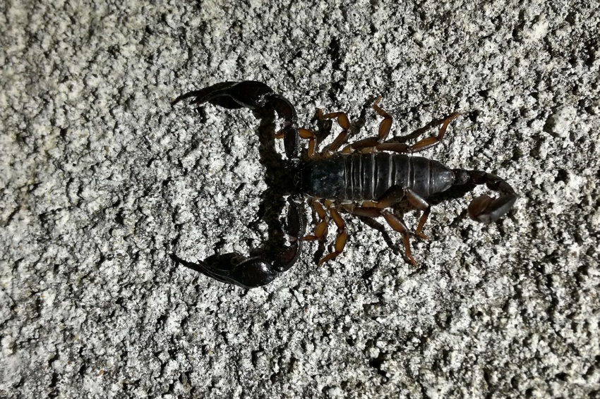 Europäischer Skorpion (Euscorpius spec.) an der Wand unseres Hauses bei unserer nächtlichen Rückkehr vom Abendessen.