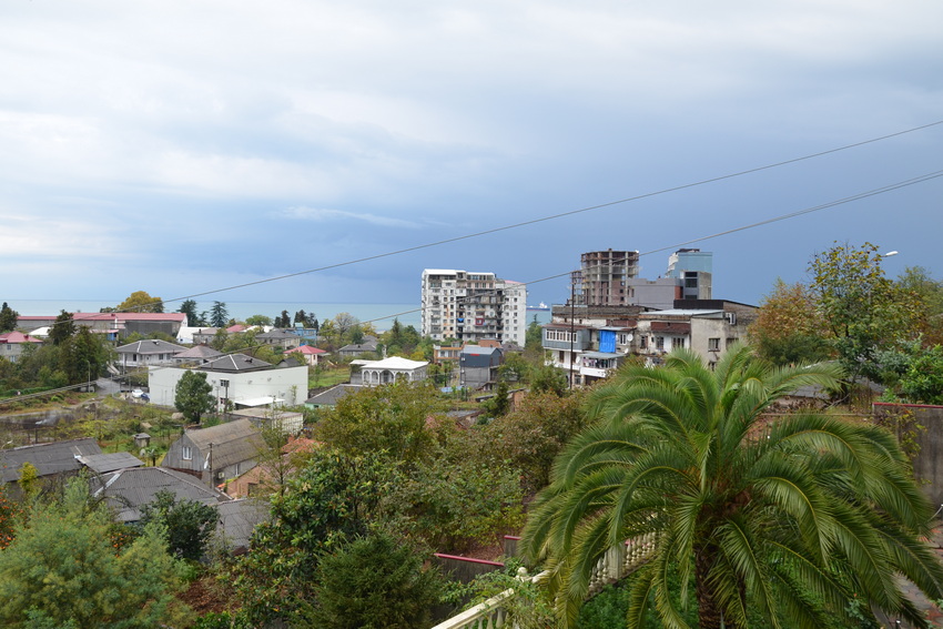 Blick von unserer Unterkunft auf den Vorort Makhinjauri und des Schwarze Meer; neben frei stehenden Häusern und Baubrachen prägen auch Plattenbauten und neu entstehende Hotelkomplexe das Landschaftsbild.
