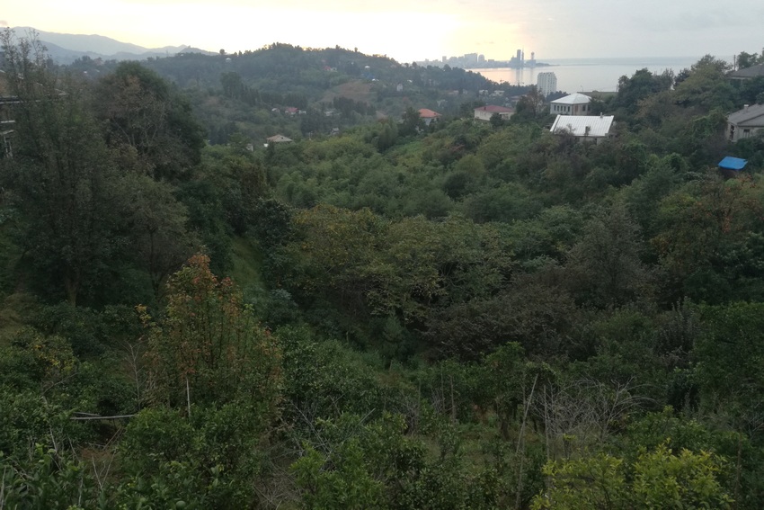 Ausblick aus dem hügeligen und sehr grünen Hinterland Makhinjauris mit üppigen Wäldern, Kulturland und Brachen auf das Schwarze Meer und die Küstenstadt Batumi im Hintergrund.