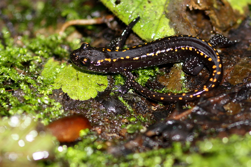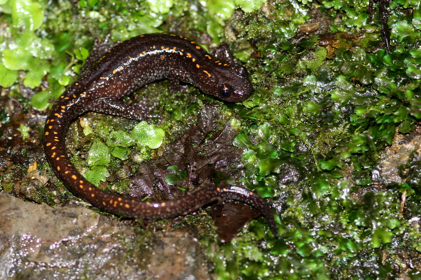 Männchen des Kaukasus-Salamanders am Wasserfall, die gelbe Fleckung ist fast komplett reduziert.
