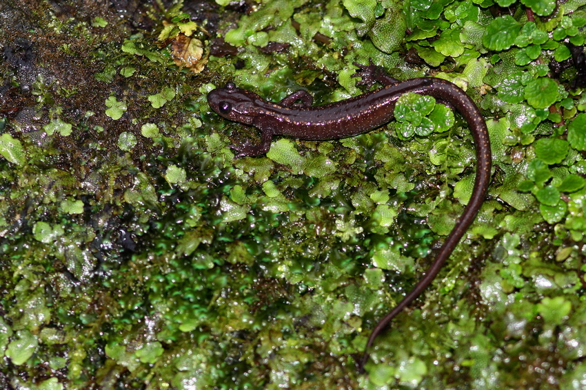 Am Nachmittag besserte sich das Wetter etwas und wir brachen nochmals in Richtung Mtirala-Nationalpark auf, um nach Adulttieren des im Kaukasus endemischen Kaukasus-Salamanders zu suchen. Hierbei konzentrierten wir uns auf die unmittelbare Umgebung der zahlreichen Bäche und suchten vor allem in Felsspalten und an Unterführungen. Es ergab sich allerdings kein Hinweis auf die offenbar recht versteckt lebende Art. Mit Hilfe einer ganz speziellen Brückenkonstruktion überquerten wir den Fluss Chakvistskali und wanderten in Richtung eines südlich davon gelegenen Wasserfalls. Ohne echte Hoffnung auf einen Fund drehte Dominik in der Spritzwasserzone des Wasserfalls einen Stein und fand dabei tatsächlich unsere ersten beiden Kaukasus-Salamander. Die im Mtirala-Nationalpark vorkommende Form gehört zur Unterart M. c. djanashvilii und zeigt im Vergleich zur Nominatform eine reduzierte Gelbfleckung. Die Tiere bewegten sich flink, fast eidechsenartig und waren mit ihren dezenten gelben Flecken und ihrer schlanken Gestalt sehr schön anzusehen. Insgesamt fanden wir am Wasserfall drei Individuen, ein Weibchen, ein Männchen sowie ein Jungtier. Auf dem Rückweg sahen wir bei einsetzender Dunkelheit ein weiteres subadultes Tier, das sich gerade aus seinem Versteck in einer Böschung hervor gewagt hatte. Mit der Kolchischen Kröte (Bufo verrucosissimus) konnten wir außerdem eine weitere Amphibienart nachweisen, die bei nun einsetzender Dunkelheit aktiv war. Glücklich und zufrieden aufgrund dieses amphibischen Highlights machten wir uns auf den Rückweg und hofften auf weitere interessante Amphibienarten am Folgetag, denn auch für diesen war Regen angekündigt...
